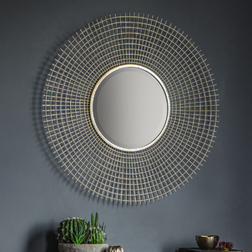 Transform your space with the Furniture in Fashion Antila Round Wirework Lattice Wall Mirror in Gold, a striking blend of elegance and contemporary design. This beautifully crafted mirror features a stunning wirework lattice frame in a sleek Gold finish, adding a touch of sophistication to any interior. Its intricate geometric detailing creates a unique focal point, making it the perfect statement piece for living rooms, hallways, bedrooms, or entryways. Designed to enhance both style and functionality, the Antila Round Wall Mirror not only reflects light to brighten up your space but also adds depth and dimension to your dcor. Whether mounted on its own or as part of a gallery wall, this mirror is a must-have for those looking to add a modern and luxurious touch to their home. Enhance your home dcor with the Furniture in Fashion Antila Round Wirework Lattice Wall Mirror in Gold, a statement piece that brings elegance, light, and style to any space! FEATURES : Material : Glass, Iron Finish : Gold A round statement mirror featuring a radial wire design with bevelled centre mirror Stylish Round Design A timeless shape that complements any dcor style Elegant Wirework Lattice Frame Intricate detailing adds a sophisticated touch Sleek Gold Finish Enhances both contemporary and classic interiors Premium Quality Mirror Glass Provides a clear and crisp reflection Light-Enhancing & Space-Expanding Makes rooms appear brighter and more spacious Durable & Sturdy Construction Crafted with high-quality materials for longevity Perfect for Any Room Ideal for living rooms, bedrooms, hallways, and entryways Easy to Install Comes with secure fittings for hassle-free wall mounting Available at an affordable price Images shown are for illustration purpose only DIMENSIONS : Height : 920mm Width : 920mm Depth : 80mm