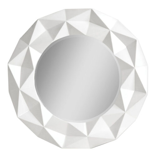 A highly contemporary geometric wall mirror with a high gloss white finish. FEATURES : Material : Polyresin, Mirrored Glass Finish : Clear, White This wall mirrors geometric design creates a striking effect on the wall Made using durable polyresin, its frame comprises a series of raised triangular shapes that combine to produce a 3D pattern The white high gloss finish gives it a contemporary look The polygonal shape frames a rounded mirror, its beveled rim softening the frame’s angled lines Available at an affordable price Images shown are for illustration purpose only DIMENSIONS : Height : 78cm Width : 78cm Depth : 6cm