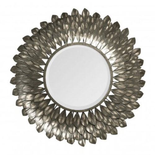 The stunning frame of the Tribes wall mirror is comprised of a series of delicately formed iron feathers. FEATURES : Material : MDF, Mirrored, Iron Finish : Clear, Antique Grey The central round mirror has luxurious beveled edges Bordered by a sliver of distressed grey iron, it will refract the light beautifully Spreading out from the mirror, four layers of overlapping iron leaves rest on a strong and stable MDF frame Gently distressed, each leaf’s indented stem highlights the attention to detail evident on this statement piece This item has a distressed look, imperfections in the wood and metal are part of the design Available at an affordable price Images shown are for illustration purpose only DIMENSIONS : Height : 70cm Width : 70cm Depth : 7cm